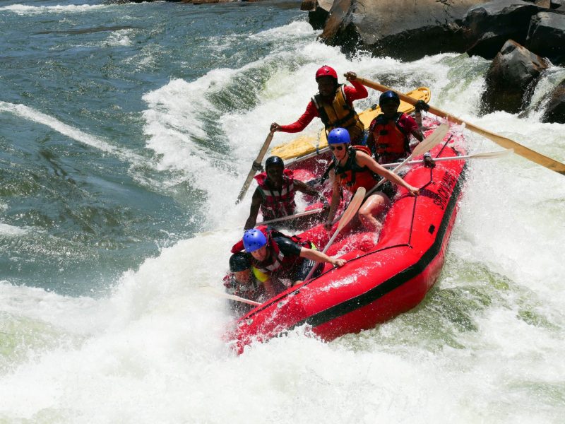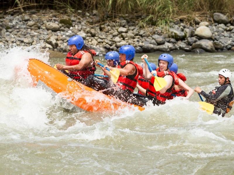 White Water Rafting Team In Bright Sunlight Pastaza River Ecuador Sangay National Park