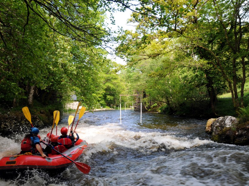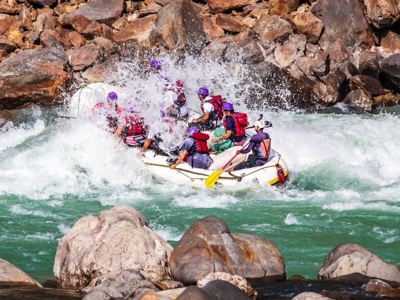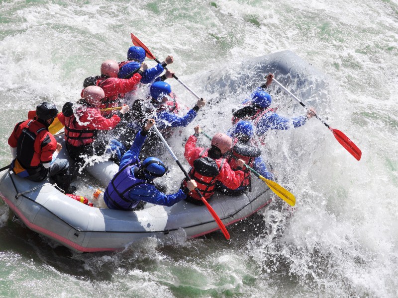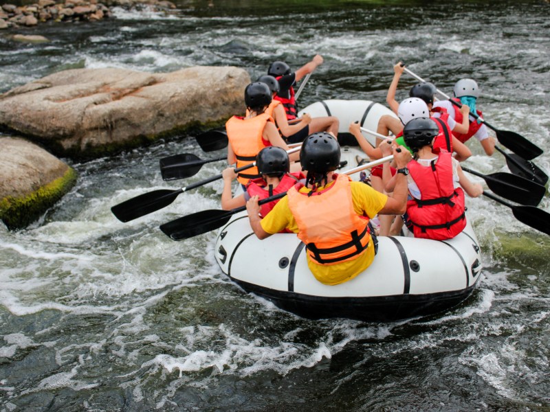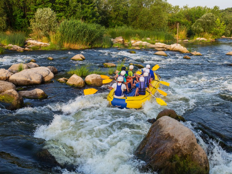 Image shows 5 people white water rafting in a yellow raft with safety gear. Faces show joy and excitement, navigating fast-flowing river with oars.