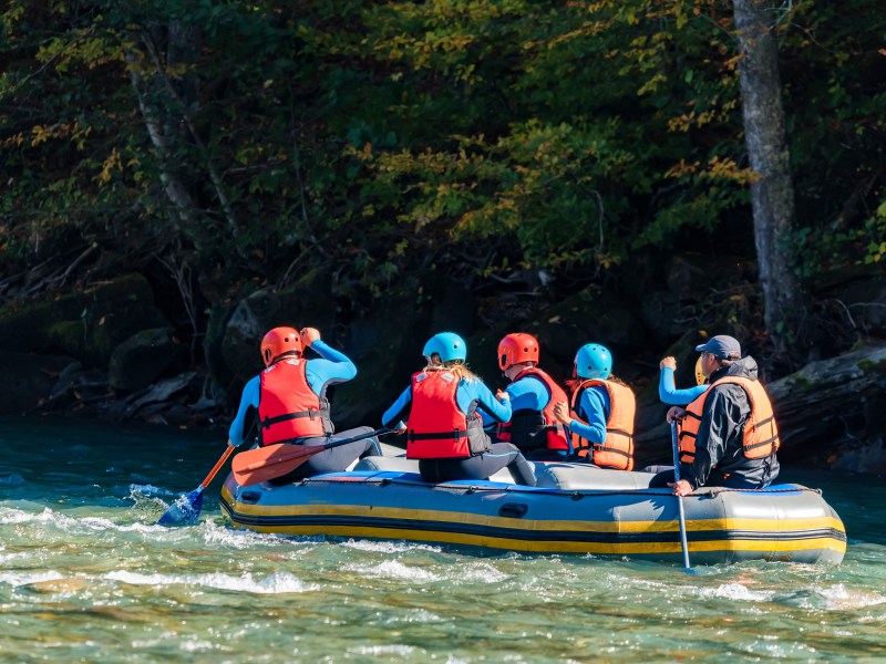 Back view of group f tourists in safety helmets on inflatable boat going rafting