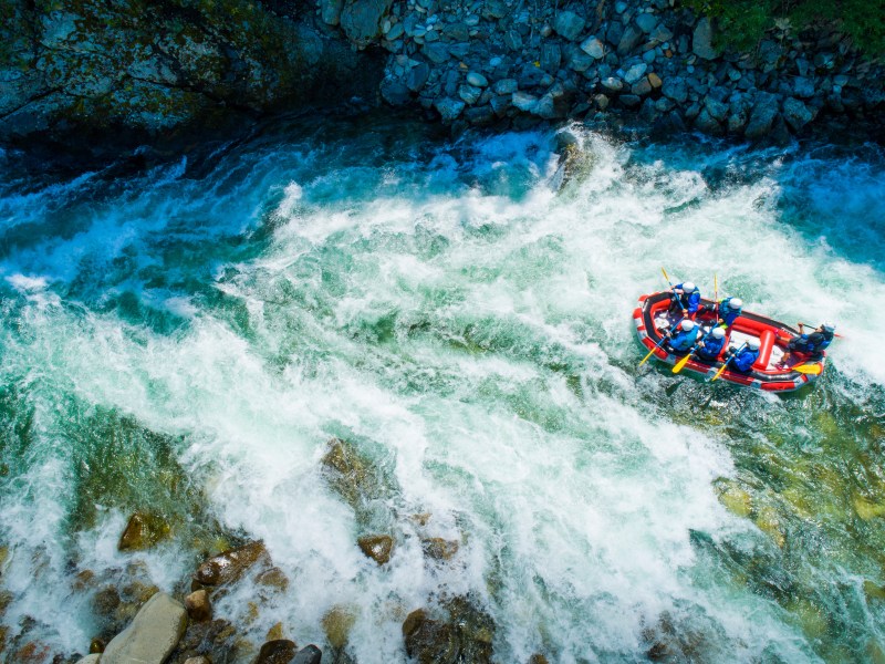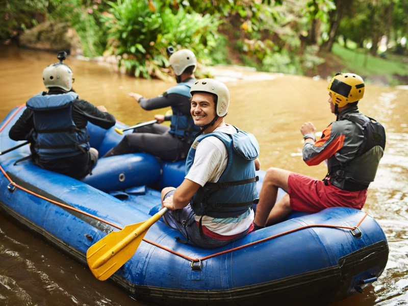 High angle portrait of a handsome young man and his friends sitting in their white water raft.